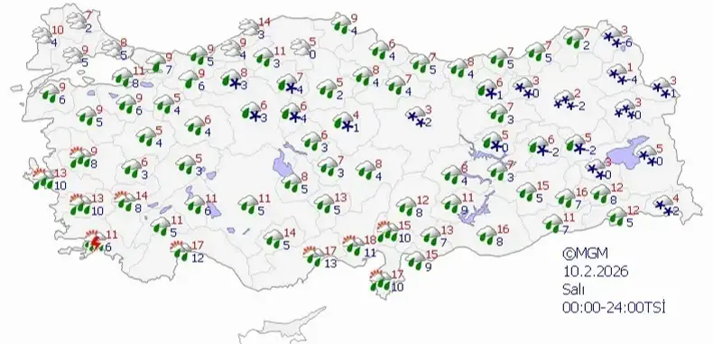 Meteoroloji Genel Müdürlüğü olarak yapılan hava durumu değerlendirmelerine göre, ülke genelinin çok bulutlu, Ege, Akdeniz, İç Anadolu, Orta ve Doğu Karadeniz, Doğu ve Güneydoğu Anadolu ile Balıkesir, Bursa, Bilecik, Sinop, Bolu çevreleri, Çanakkale’nin doğusu, Kırklareli, İstanbul ve Kocaeli’nin kuzey ilçelerinin aralıklı yağışlı geçecek. Yağışların genellikle yağmur ve sağanak, iç ve doğu kesimlerin yüksekleri karla karışık yağmurlu, Doğu Anadolu’nun doğusunun kar yağışlı geçeceği tahmin ediliyor.