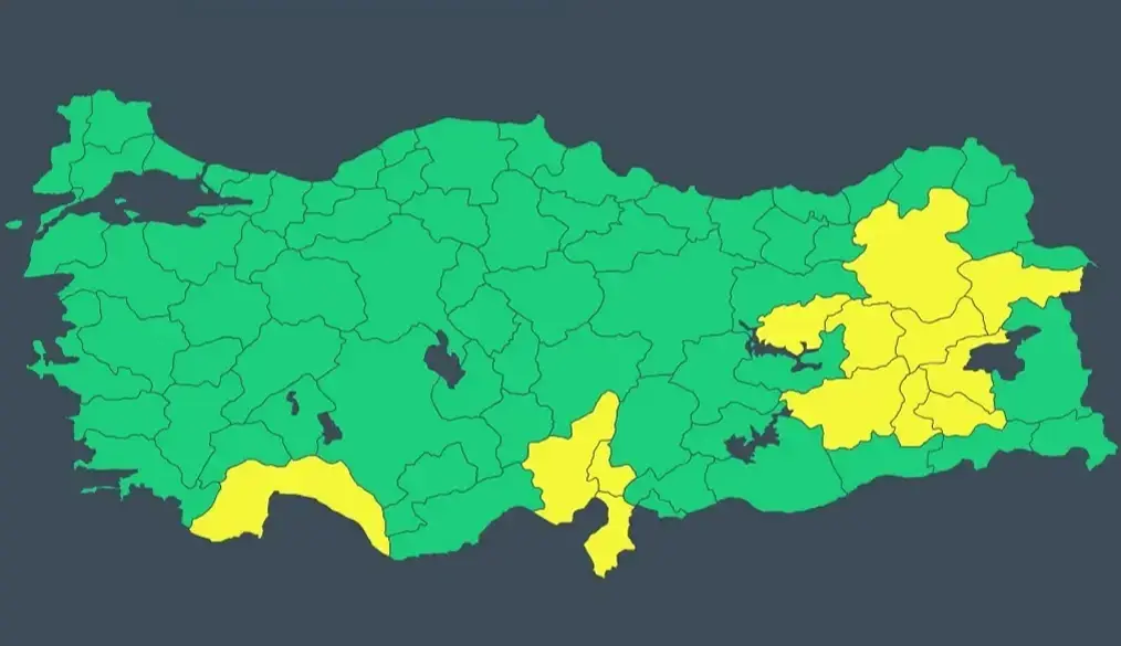 Sarı kodlu uyarı yapılan iller: Adana, Ağrı, Antalya, Bingöl, Bitlis, Diyarbakır, Erzurum, Hatay, Muş, Siirt, Tunceli, Batman, Osmaniye